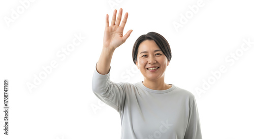Smiling asian woman waving hand, conveying warmth and friendliness in a simple and welcoming gesture of greeting