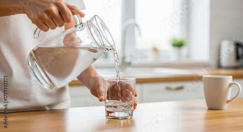 Person pouring clean water from glass pitcher into drinking glass on kitchen counter promoting easy access to hydration and calm everyday moment