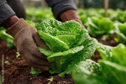 African American man wearing gloves is harvesting fresh lettuce in a lush green field, showcasing agricultural practices and the importance of sustainable farming methods