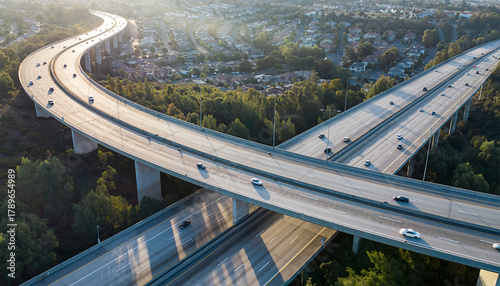 Aerial view of elevated highway interchange with curved roads and vehicles in suburban area