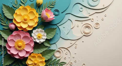 Beautiful 3D paper cut floral background with yellow, pink, and white flowers on a pastel blue and beige backdrop. Elegant design for spring, wedding, or celebration invitations. Decorative flower art
