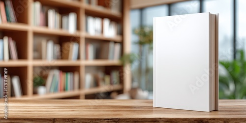 Blank stand-up book mockup on library table