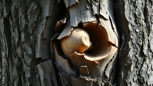 custodianship. Close-up of tree trunk with abnormal swelling and torn bark, textured botanical imperfection. gardening catalogs, home-decor guides, designed for gardening and botanical catalogs.