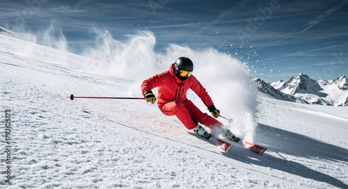 Skier in a red suit skiing fast down a snowy mountain slope. Dynamic action shot of an athlete carving in fresh powder. Winter sports and alpine adventure concept