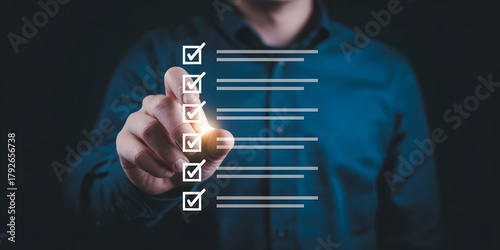 Person s finger tapping a digital checklist with completed tasks highlighted on a dark background