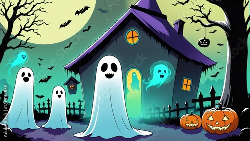Playful Ghosts Around a Haunted House with Pumpkins and Eerie Night Atmosphere