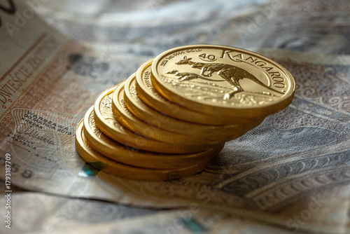 Złote monety na tle polskich banknotów