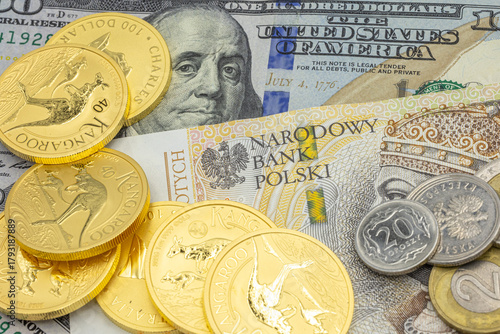 Złote monety na tle amerykańskich i polskich banknotów