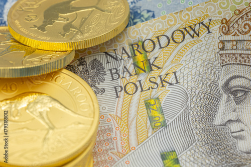 Złote monety na tle polskich banknotów