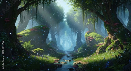 Enchanted forest with a stream, lush greenery, and ethereal light filtering through the trees.