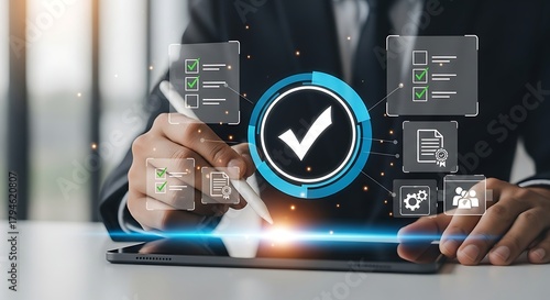Business professional interacting with a digital interface displaying a verified checkmark and various icons representing business processes and data analysis on a tablet screen