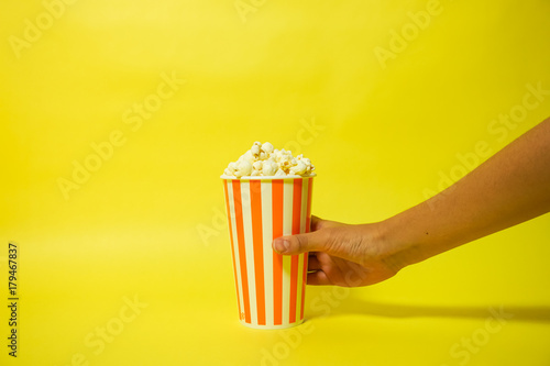 ポップコーンを手につかむ、手に持つ シンプル素材 黄色背景