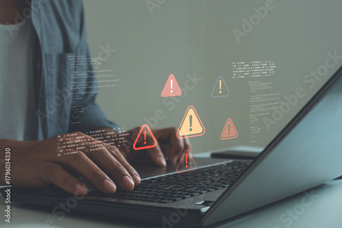 Cybersecurity concept showing a programmer typing on laptop with warning alert icons and code errors, symbolizing data breach, system vulnerability and cyber threat detection in digital networks.