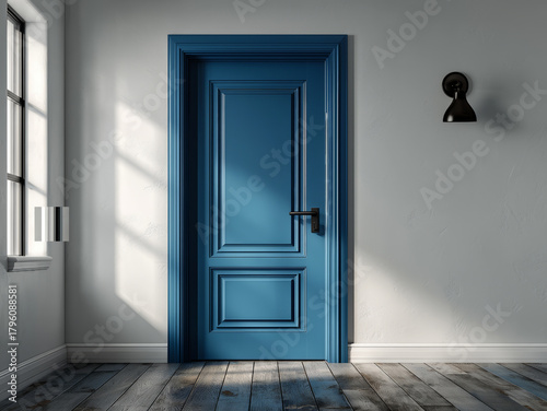 Elegancka aranżacja z niebieskimi drzwiami i drewnianą podłogą