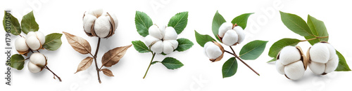 Cotton plants with white cotton bolls and green leaves on a white background.