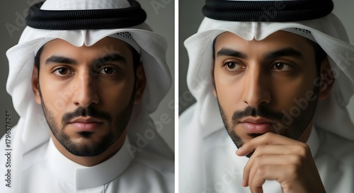 Close-up portrait of a young Middle Eastern man wearing traditional attire, including a white kandura and a black agal, with a thoughtful expression on his face