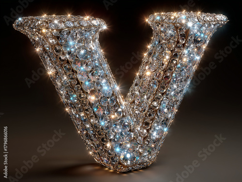 Trójwymiarowa litera V całkowicie pokryta błyszczącymi, osadzonymi diamentami i złotymi akcentami na ciemnym tle. Wyjątkowy luksus i blask.