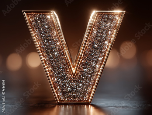 Litera V z osadzonymi, błyszczącymi diamentami, na różowo-złotej ramie. Stoi na ciemnej, odbijającej światło powierzchni. Luksusowy monogram.