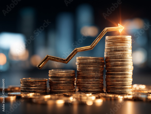 Złote monety ułożone w rosnące słupki, nad którymi unosi się strzałka wzrostu skierowana w prawo. W tle rozmyty widok miasta. Sukces finansowy.
