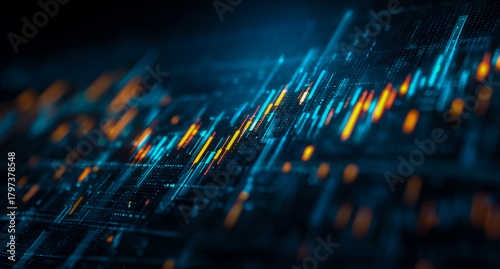 Abstract digital financial stock market graph with glowing blue and orange lines on a dark background