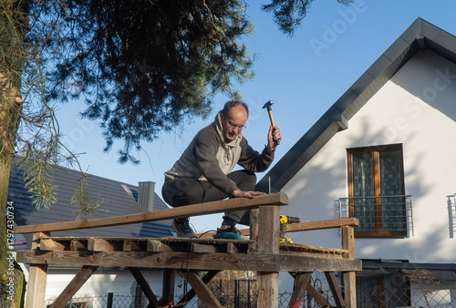 mężczyzna przybijający gwoździe w konstrukcji z belek drewnianych