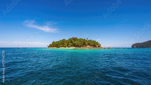 Tropical isle surrounded by vast ocean beneath a clear blue sky