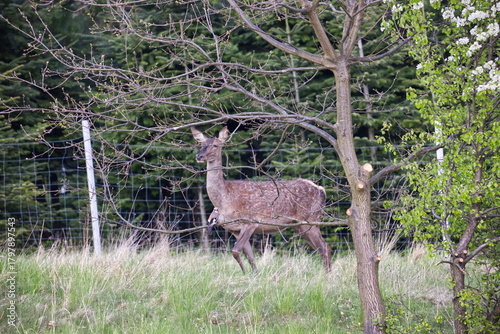 Przedwiośnie, popołudniowe godziny , łanie jelenia europejskiego (Cervus elaphus elaphus) w zmienionym swoim futrze. Myśliwi nazywają to wiosenną zmianą sukni.