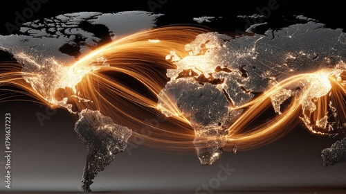 Dynamic Global Connectivity Visualization with Bright Streams of Light Depicting World Networks and Data Flowing Across Continents at Night