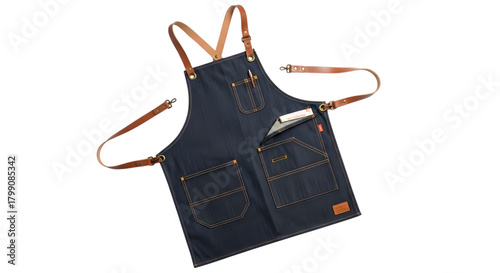 Denim apron with leather straps isolated on transparent background for work or craft