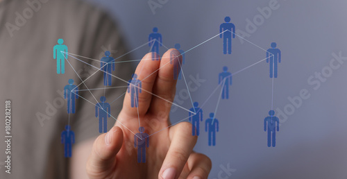 Hand reaching towards a digital human network. Teamwork and communication concept. Network of people connected with each other. Business, intern