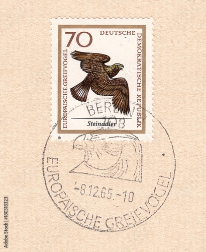 Berkut (Aquila chrysaetos)-bird of prey of the family accipitridae, is the largest eagle.Special postmark Berlin,European birds of prey.Postage stamp Germany 1965