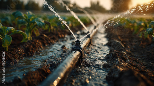 Innovative irrigation system in modern agricultural field spraying water over young crop rows at golden hour, efficient micro sprinkler delivering precise moisture and sustainable farming care