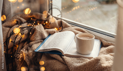 Cozy Christmas morning with warm blanket, cup of cocoa, and book