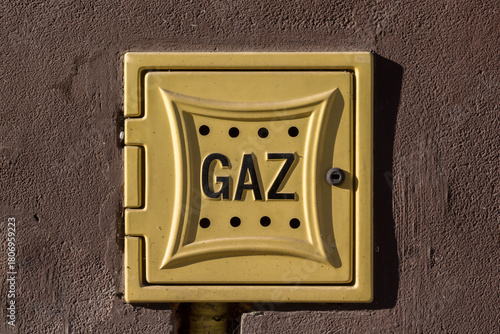 Żółta skrzynka gazowa na ścianie budynku, detal miejskiej instalacji.