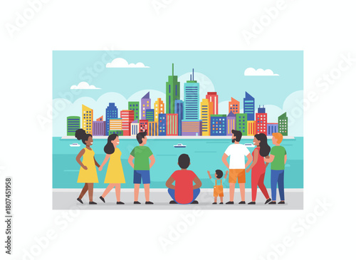 A colorful flat vector cartoon depicts a crowd of adults and children at the waterfront admiring a modern city panorama, with men and women gazing at the megapolis skyline
