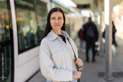 Young woman walks through streets of city, wait tram at transport stop station.