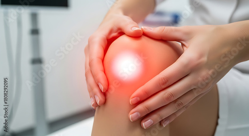 Woman suffering from acute knee pain, with red glow highlighting inflammation and injury
