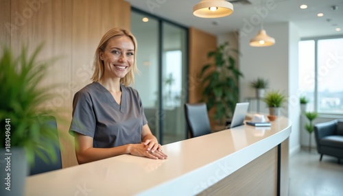 Smiling receptionist in uniform stands behind a modern reception desk in a clean office. She looks friendly and welcoming to visitors or patients arriving.