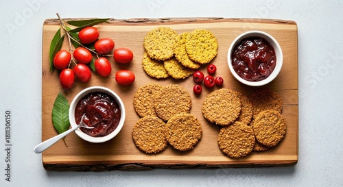 Assortment of Jams and Crackers on Rustic Serving Board