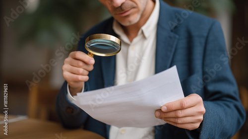 A journalist reviewing printed documents with a magnifying glass, searching for fine-print discrepancies during an investigative report — media research, truth-seeking, and document verification.
