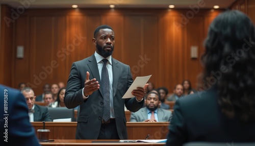 African American lawyer presents case in court. Man holds papers, speaks passionately to judge, jury at law trial. Attorney defends client, argues justice in judicial system. Legal process unfolds.