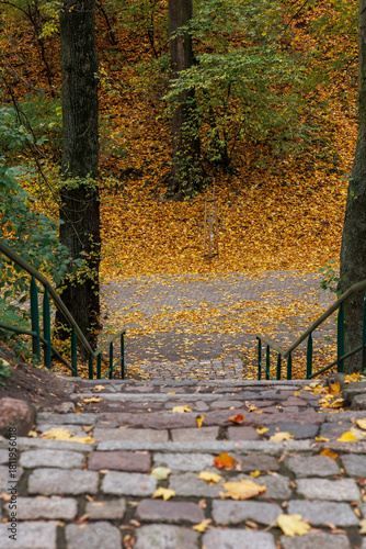 Jesienna alejka parkowa ze schodami otoczonymi drzewami i opadającymi liśćmi, tworząca spokojny, nastrojowy klimat sprzyjający refleksji i wyciszeniu. Naturalne światło i ciepła kolorystyka podkreślaj