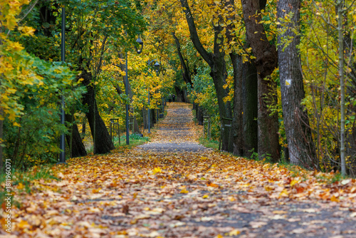 Spokojna alejka w parku pokryta jesiennymi liśćmi, tworząca nastrojowy klimat sprzyjający relaksowi i refleksji. Idealne tło do tematów związanych z naturą, spokojem, mindfulness i sezonem jesiennym.