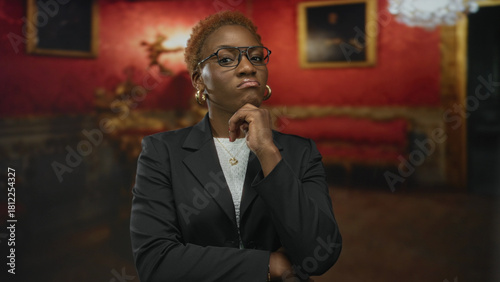 Young african american woman in black blazer stands with hand on chin inside a museum building; doubt.