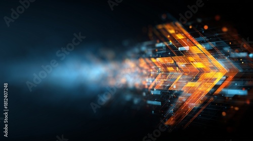 Abstract glowing arrow composed of digital circuit and data fragments moving right, symbolizing business transformation and growth, speed, innovation, and strategic direction.