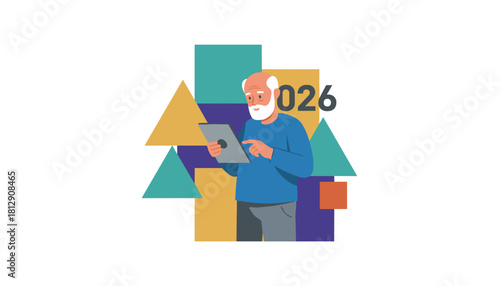 Senior man using a tablet with geometric shapes and 2026 Retirement future planning and digital life
