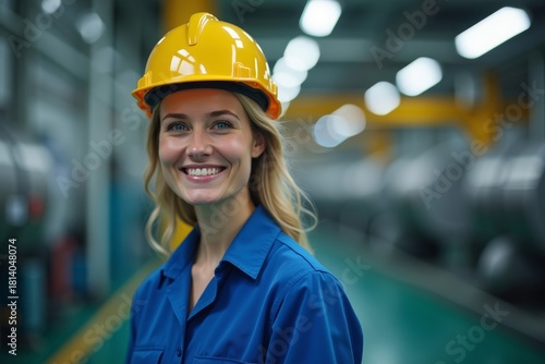 Confident Female Nuclear Engineer Joyfully Posing in Nuclear Power Plant