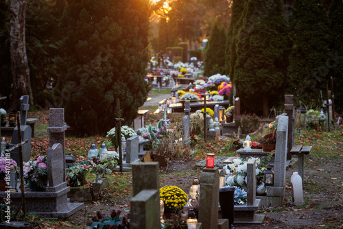 Jesienna alejka na cmentarzu prowadząca między nagrobkami, otoczona kwiatami i zniczami pozostawionymi po obchodach święta zmarłych. Kompozycja oddaje atmosferę ciszy, zadumy i przemijania.
