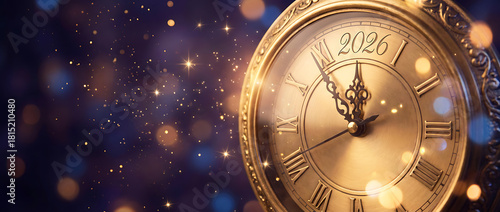 happy new year 2026 countdown clock on abstract glittering midnight sky with copy space, festive party invitation card concept for new years eve