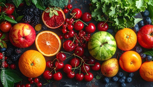 Assortment of Fresh Ripe Fruits Including Oranges Apples Tomatoes and Cherries Garnished with Blueberries and Green Leaves on a Dark Textured Surface